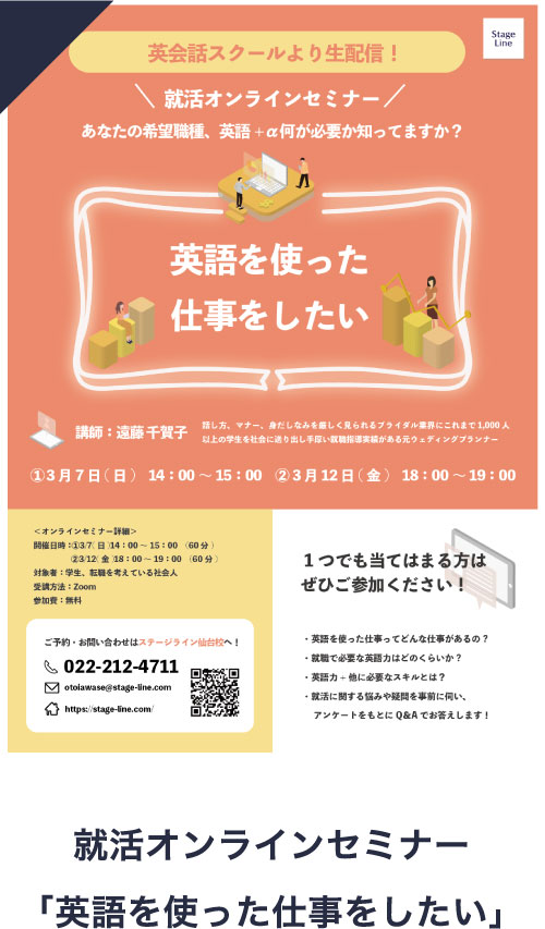 仙台・名古屋の英会話ならステージライン|全スクール駅近|100%月謝制で通えるので初心者でも安心。カフェのようなサロンレッスンやマンツーマンレッスンも人気!