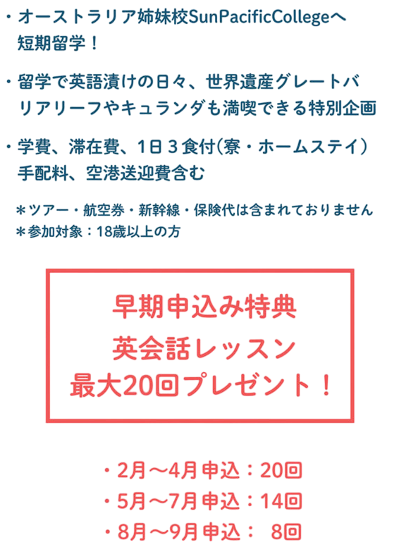 【仙台校】GWプチ留学旅行2025 今年のゴールデンウィークに初の✨「GWプチ留学旅行2025」✨を開催! 今回は、海外旅行が初めてという生徒さん2名がドキドキの出発でした✈️ 📸 ケアンズ空港に到着した直後の1枚 初めての南半球に Read More » 2025年6月13日