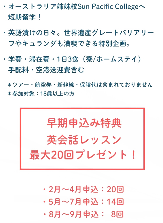 【仙台校】大人の修学旅行2024 ~Sun Pacific College到着編~ \大人の修学旅行2024レポ/ 【Sun Pacific College到着編】 無事ケアンズ・Sun Pacific Collegeに到着~🌴💛 今年は出発早々新幹線が遅れたり、みんな無事合流できるか?! とハラハ Read More » 2024年11月9日
